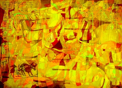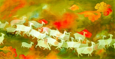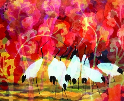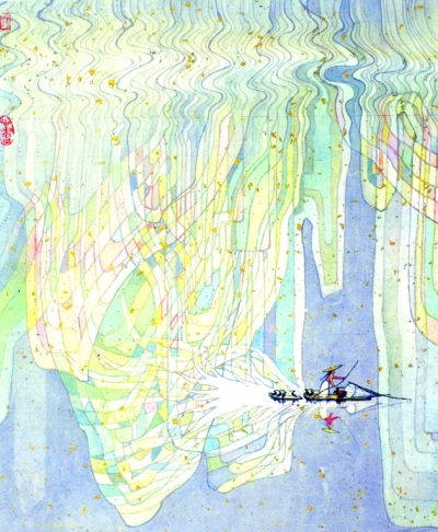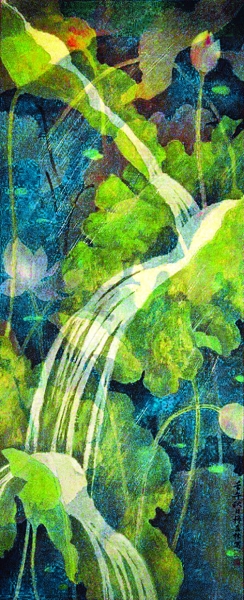 宣紙繪畫的普及并不能完全取代帛畫的藝術地位。帛畫所用的絲織品擁有透疊性、折光性和色彩的高飽和度等特性,這些特性能使帛畫產生其他畫種無法比擬的獨特魅力。如果說宣紙畫以水墨見長,帛畫則更長于丹青。從西漢馬王堆帛畫到現代新帛畫,帛畫中所運用的濃烈的色彩使其在中國繪畫藝術中占有不可替代的重要一席。此次所選的現代帛畫藝術家穆益林的帛畫作品淋漓盡致地展現了作者對于帛材料特性的充分運用。這些畫具有濃烈的裝飾風味,構圖新穎別致,在絹帛上將顏料盡情地鋪撒開來,色彩重疊交錯,意境悠遠,充分展現了帛材料之美,將帛材料的特性與繪畫技法恰如其分地結合起來,既古樸高貴又頗具現代之感。
