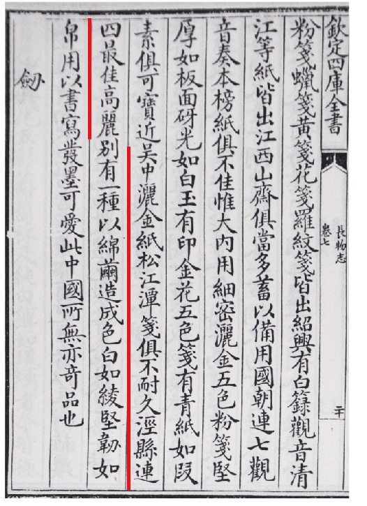 連四是宣紙某個(gè)品種的古代名稱,古代多本《涇縣志》上均有記載。涇縣從南宋嘉定初年(1208年)開始修志,到清代道光五年(1825年)的600多年的時(shí)間里,共修纂志書15次,現(xiàn)有明嘉靖三十一年(1552年)、清順治十三年(1656年)、乾隆十七年(1752年)、乾隆十八年(1753年)、嘉慶十一年(1806)《涇縣志》和道光五年(1825年)《涇縣續(xù)志》等年代的《涇縣志》存世,其余9部不同年代的涇縣古代方志均已遺失。涇縣連四信息主要咋愛清代《涇縣志》上體現(xiàn)的居多。