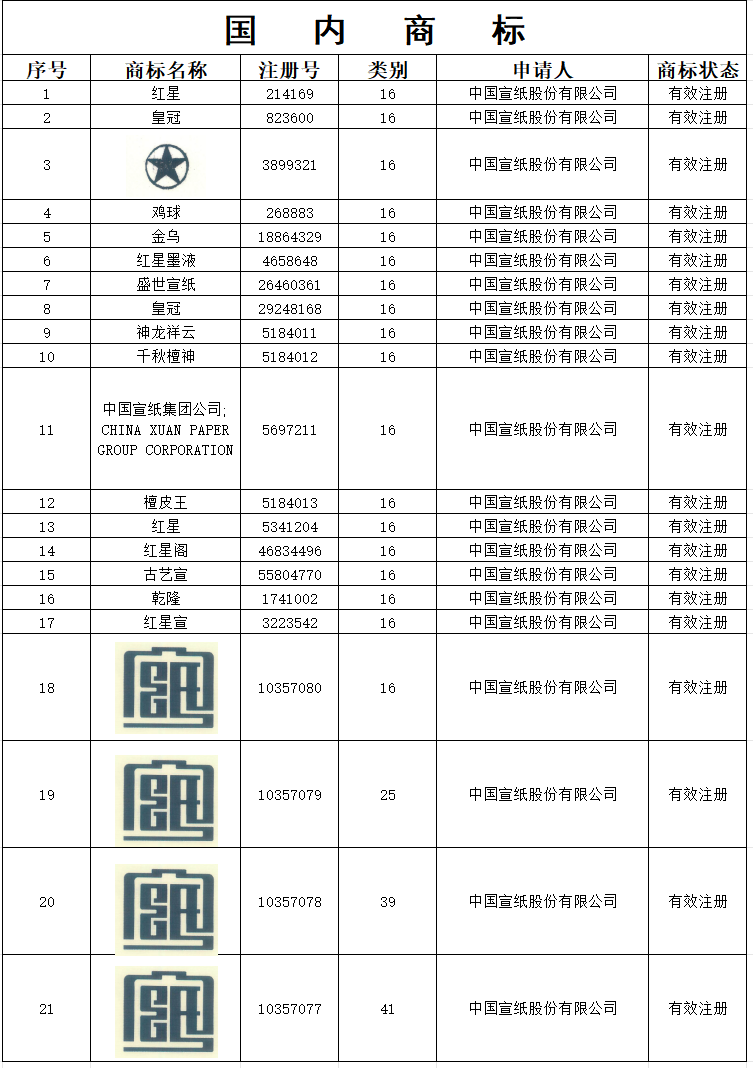 公 告 近日以來,我司發現有其他單位及個人非法使用我司注冊商標,侵犯我司權利,對此,我司已經通過法律途徑進行了維權處理。 注冊商標受到國家法律的保護,任何單位及個人未經注冊商標所有人許可或授權,均不可擅自使用,否則將承擔法律責任。 中國宣紙股份有限公司特此聲明,對以下商標擁有合法權利,請廣大消費者購買時仔細甄別,謹防假冒,也請廣大生產、經銷單位及個人了解知悉,停止侵權行為。 紅星宣紙 中國宣紙股份有限公司始創于1951年,距今已70余年。是全國***的文房四寶生產企業、手工造紙領袖企業、人類非遺“宣紙傳統制作技藝”項目申報單位和保護與傳承的代表性單位、宣紙和書畫紙國家標準起草單位,被授予全國最具影響力國家文化產業示范基地、國家級非遺保護示范基地、國家重點文化出口企業、全國工業遺產等多項稱號。所產“紅星牌”宣紙是國家地理標志產品,是2008、2022年北京奧運會運動員獲獎證書用紙。 發展歷程