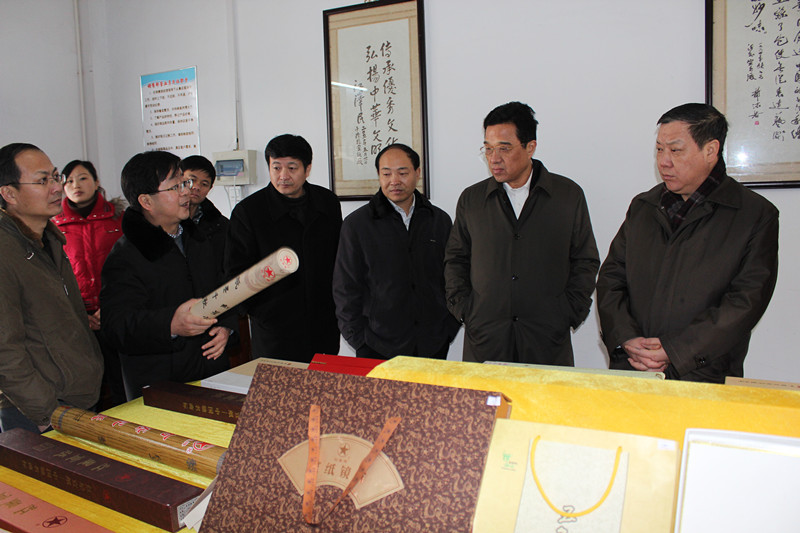 2013年1月11日上午,省委常委、省紀委書記王賓宜在縣領導的陪同下蒞臨我公司的宣紙文化園,集團公司董事長胡文軍熱情接待。在觀園的過程中,王書記了解了宣紙傳統制作工藝流程并親自體驗了撈紙技藝。