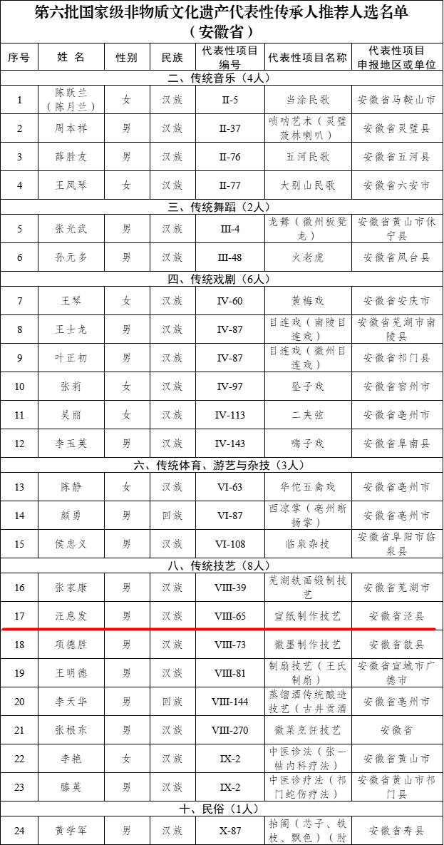 2008年,汪息發獲得“省級非物質文化遺產項目宣紙代表性傳承人”稱號。2016年,他又榮獲“江淮工匠”稱號。