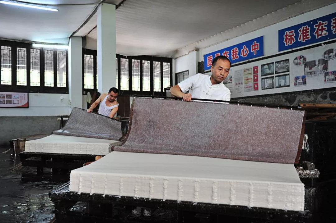 順著嘩嘩的水聲,便走進了一個撈紙車間,迎面而來的是一排幾十個撈紙槽,每槽兩位師傅緊密合作,用手中竹簾在紙漿中輕舀兩下,一位師傅抬起簾往槽外輕巧一掀,一張“宣紙”就完完整整落了下來。