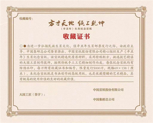 中國郵政集團有限公司宣城市分公司負責人表示,“方寸天地紙上乾坤”《辛丑年》生肖紀念宣紙套裝是郵政生肖文化、集郵文化和宣紙文化的完美結合,是推動中國傳統文化傳承和創新的又一次生動實踐,對進一步宣傳和推廣宣城市中國文房四寶之城文化品牌,促進文化產業融合發展具有重要意義。