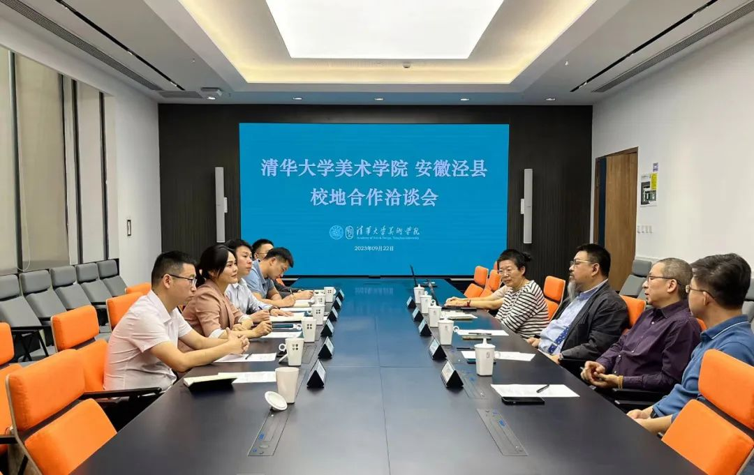 在清華大學美術學院,學院負責人介紹學校有關情況,并對此次校地合作方向表明態度。常浩向院方介紹涇縣縣情及宣紙產業情況發展,表示宣紙是中國文房四寶之首,涇縣又是宣紙之鄉,希望與學院共同挖掘并推廣宣紙傳統文化,拓展合作新思路。依托“非遺進校園“、宣紙文創大賽等活動深化與院方文化創意合作,打造宣紙文創名片,放大宣紙品牌效應。中國宣紙股份公司黨委書記、董事長趙胡鯤向院方介紹本次校企合作項目,希望與校方就宣紙創意運用及文創產品開發展開合作,雙方就下一步合作具體事項達成了初步共識。