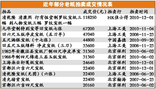 另一名在北京的市場行家透露,在北京琉璃廠里,老紙身價大漲,別提清代民國的宣紙,連上世紀80年代中期生產的、僅有20多“歲”的宣紙,一刀(即100張)叫價也至少要2萬元左右,他就曾以1.6萬元的“同鄉價”買下一刀。而乾隆年間的冰紋蠟箋紙,一張尺寸不過40厘米×60厘米左右,價格就可達數萬元。