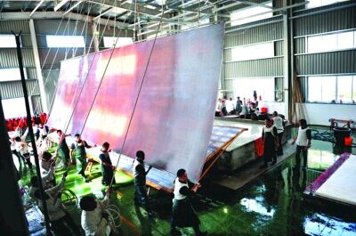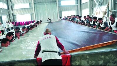和著嘹亮的勞動號子,44名技藝精湛的漢子抬著長11.4米、寬3.6米的竹簾,整齊劃一地重復著撈紙動作,一簾水、二簾水。他們在紙漿槽里來回托挽兩次,屏息凝氣,靜待水從竹簾瀝下,紙漿便均勻而平坦地鋪在竹簾上。接著,一直站在槽邊的8名輔工拉緊繩子,竹簾應聲而起。隨著龍門吊上的滑輪轉動,大家護送紙簾到上帖區,整個過程一氣呵成,莊嚴而神圣。