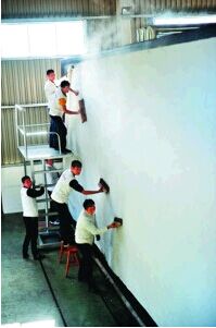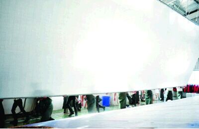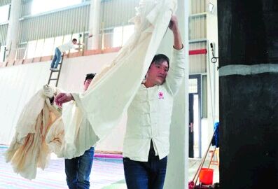 紙帖上,紙張積累到150張時,工人將紙帖抬到烘干區。紙烘干到一定程度,8個牽紙工騎在木梯上,從兩頭往中間小心翼翼將紙一張張撕下,送往曬紙區。曬紙區高溫墻兩側各有6人,分上中下三個部位,用紙刷將濕漉漉的紙刷上高溫墻,水汽瞬間升騰而起。當紙張漸漸變硬,工人再細致地卷起,將其送到檢驗區,檢驗女工從頭到尾細致觀察,剔除次品,然后裁剪成統一規格,一張尺寸達11米×3.3米的“超級宣紙”才算真正完成,可以蓋上印章封存起來。