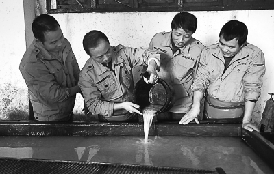 對于中國古老、傳統的宣紙制造業來說,在整個108道工序中,你若能最終跨進水槽、當上一位神奇的撈紙工,那就算是撈上了。要知道,這整整108道工序的工匠,猶如梁山那108位好漢,而技術含量最高的撈紙工,正好比80萬禁軍教頭林沖,其武藝高強,無人能敵。周東紅剛剛走進造紙廠時,幾個月都沒能靠近那神秘的水槽。最后,也就勉勉強強下過兩次水,撈出的紙,破綻太多,猶如武功欠佳,出手就能讓人抓住漏洞。