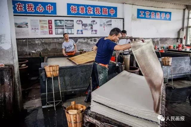 “做這一門技術,難就難在厚的、薄的、大的、小的宣紙你都要能做。”也就是說,只是撈均勻了還不能算是成品,還要把握好分量,宣紙品種很多,每種在分量上都有規定,每張宣紙重量上的誤差都不能超過1克。此外,剛在紙槽里加進去紙漿的時候濃度比較高,每撈一張都會稀一點,濃度越來越低,如何做到濃度高和濃度低的時候厚薄一樣呢?靠的全是兩個人的配合和手感。撈出來的紙在疊放的時候,也不能有起泡、滴水洞等毛病。